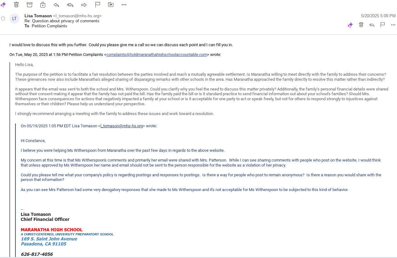 Maranatha High School "CFO" Lisa Tomason Offers to Slander Family to Complete Stranger