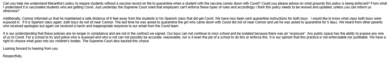 Rouse knew we would speak up and say something after repeated quarantines for our healthy boys in 2022. So when he called the meeting with us - he immediately said "I've seen the emails and communications with "my staff." My first reaction was, "what emails?" But Mr. Rouse needed to deflect from the real issue - me calling the school out on unethical behavior and make up a new issue which he branded our "disrespectful emails" about COVID - a total lie.